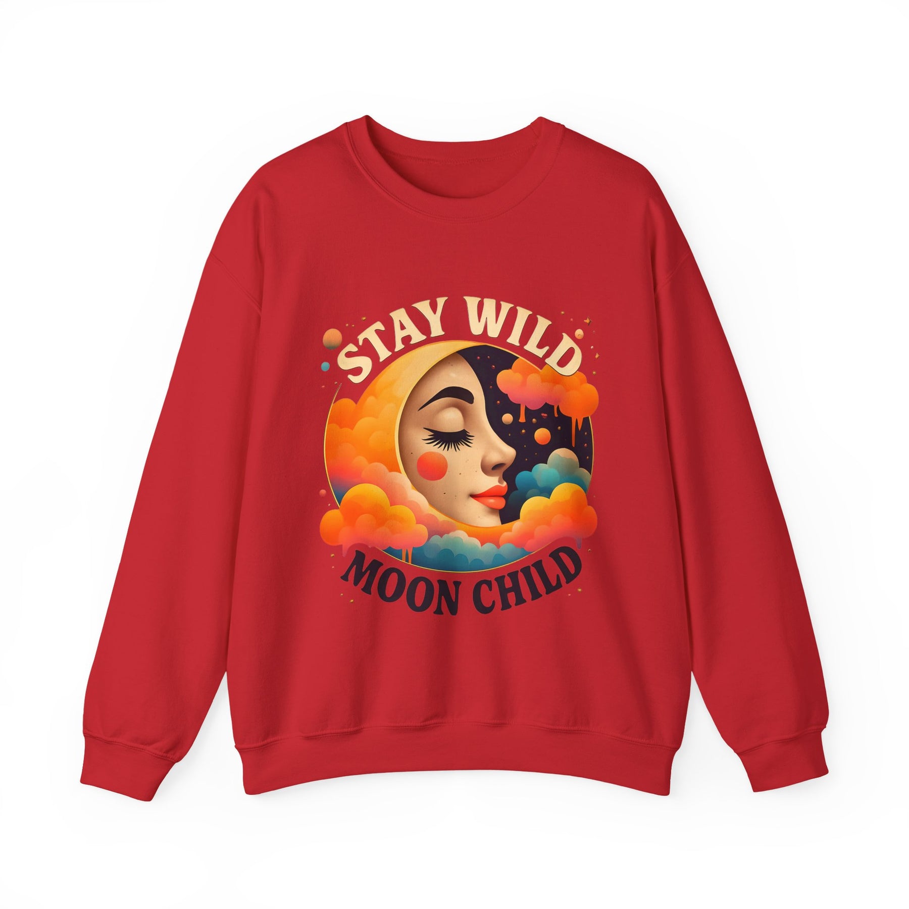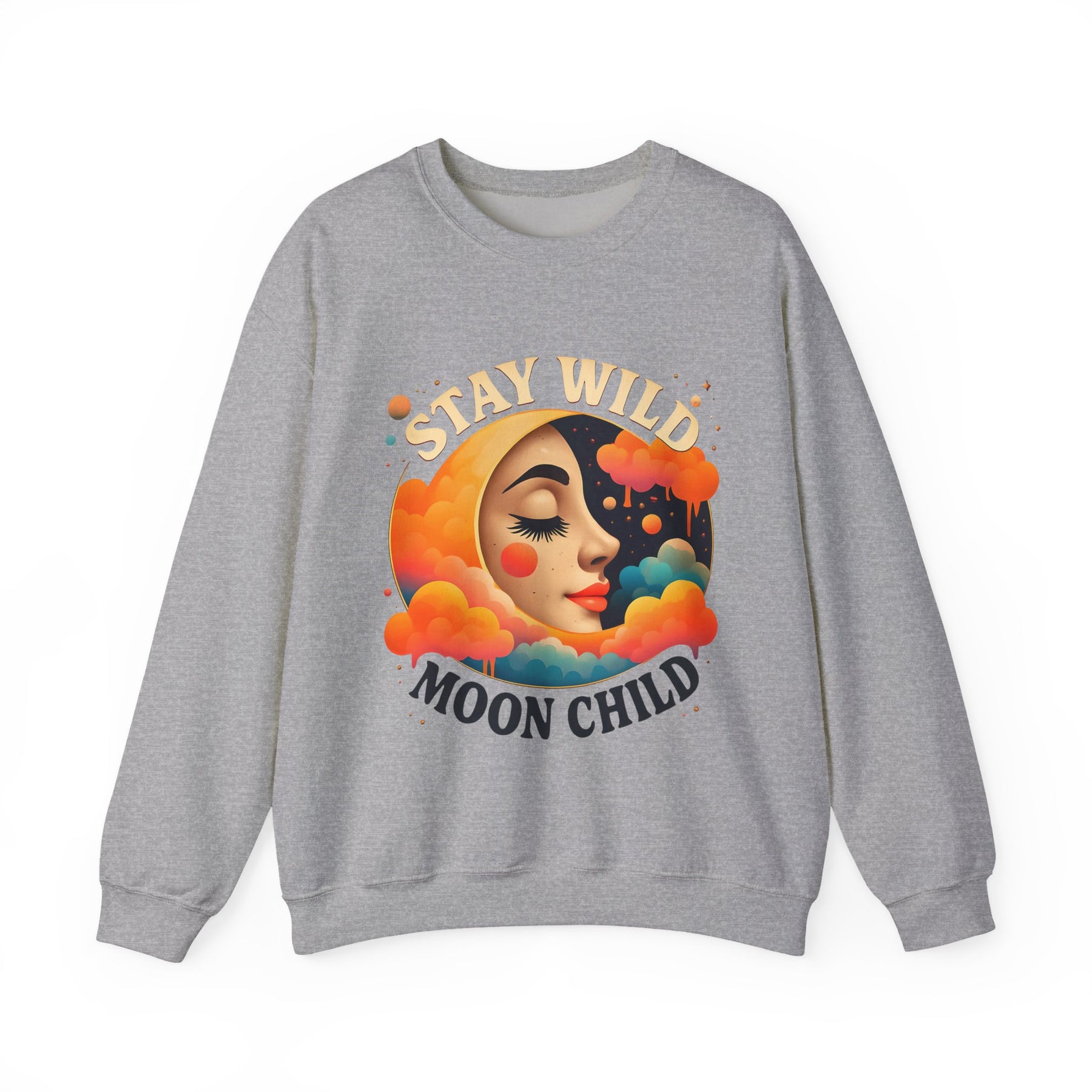 Wrap yourself in cosmic magic with the Stay Wild Moon Child sweatshirt — a dreamy blend of retro vibes and moonlit mystique. Featuring a radiant moon face surrounded by sunset clouds and starry skies, this celestial pullover was made for stargazers, free spirits, and spiritual souls.