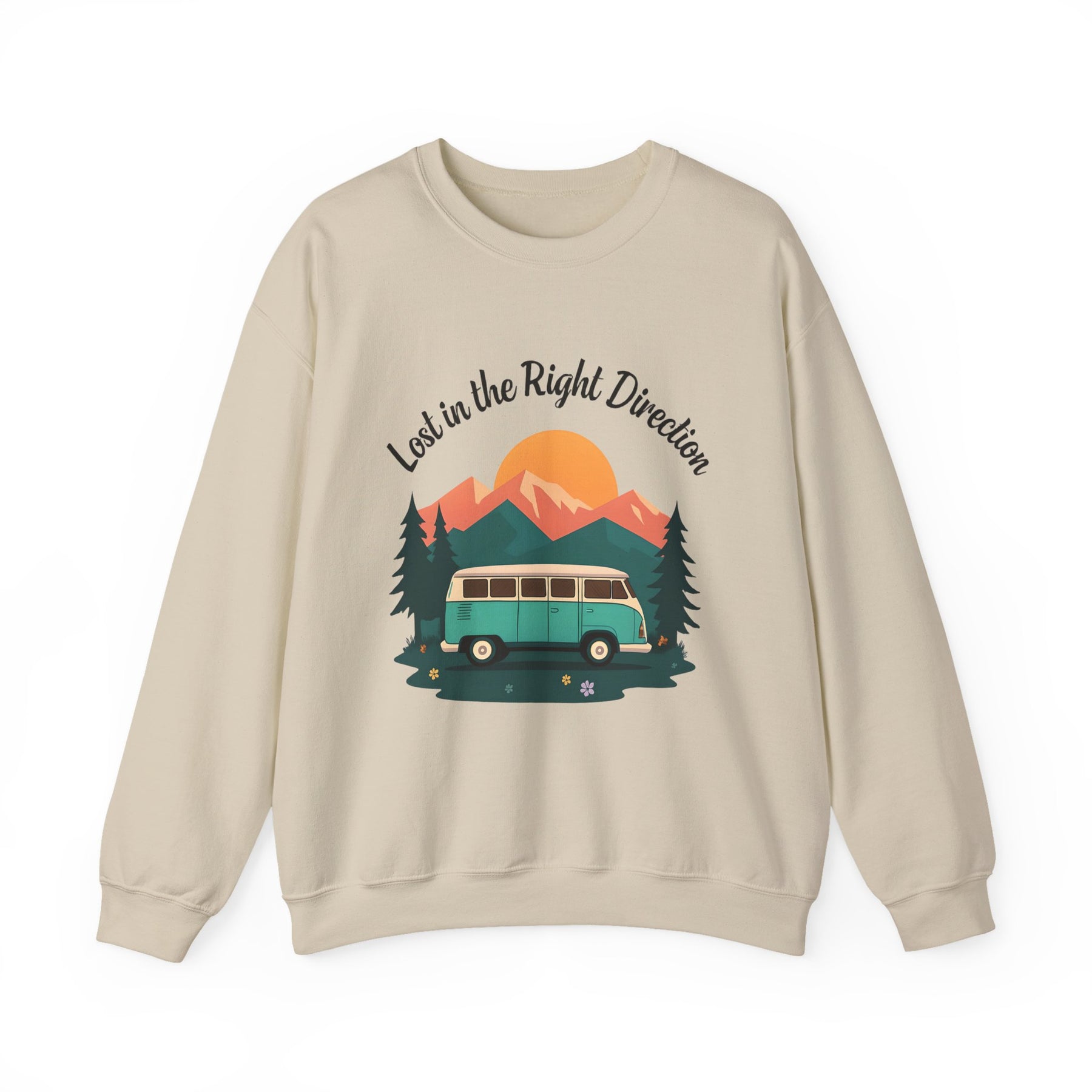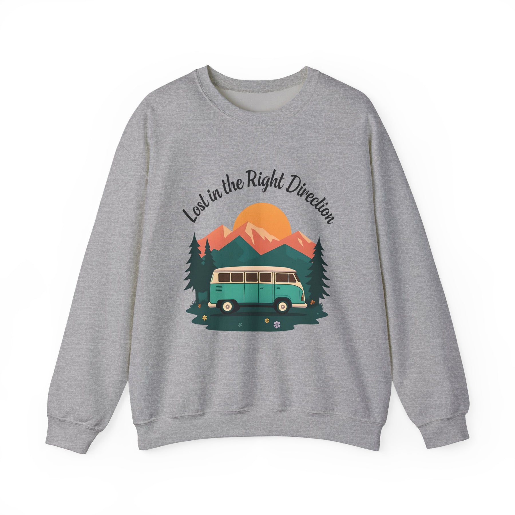 Wander without worry in the Lost in the Right Direction sweatshirt — a cozy blend of retro road trip vibes and outdoorsy charm. Featuring a vintage camper van cruising through pine trees under a glowing mountain sunset, this design celebrates the spirit of adventure and the beauty of getting a little lost along the way.