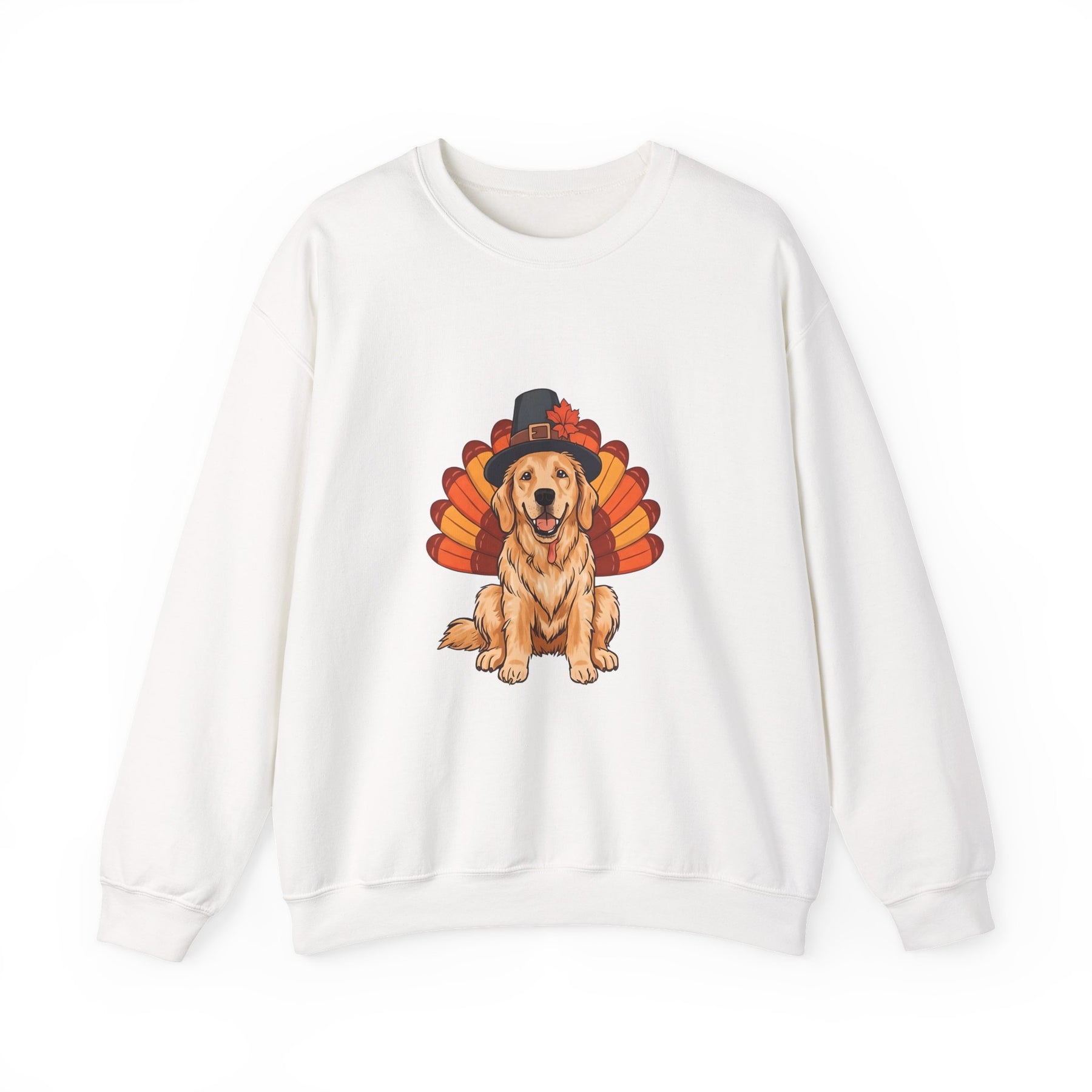 This festive sweatshirt features an adorable golden retriever dressed as a turkey, complete with autumn feathers and a pilgrim hat. It’s the perfect mix of playful and seasonal, bringing warmth and smiles to every fall gathering.
