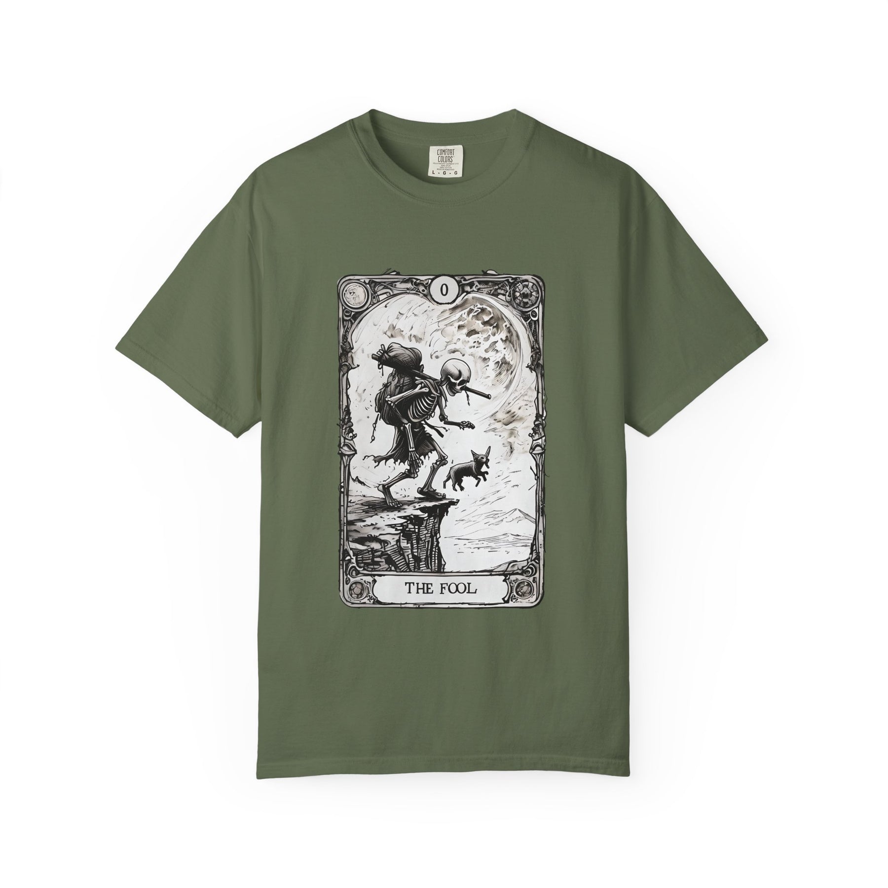 Step into the mystical unknown with The Fool Tarot Card Skeleton T-Shirt, featuring an intricate black-and-white design reimagining “The Fool” card from the Major Arcana. A haunting skeleton, loyal dog companion, and chaotic moon set the scene for adventure, transformation, and faith in the journey ahead.