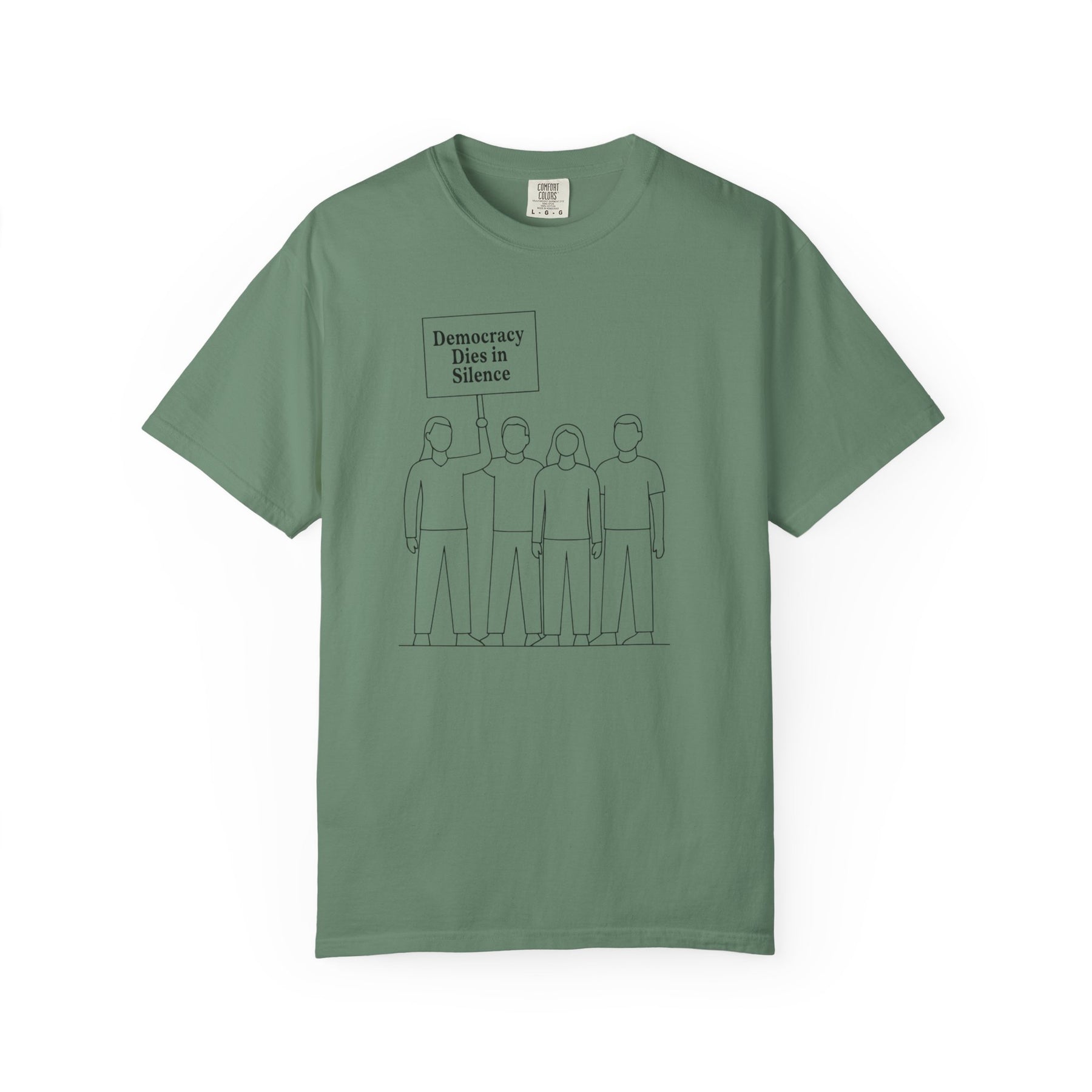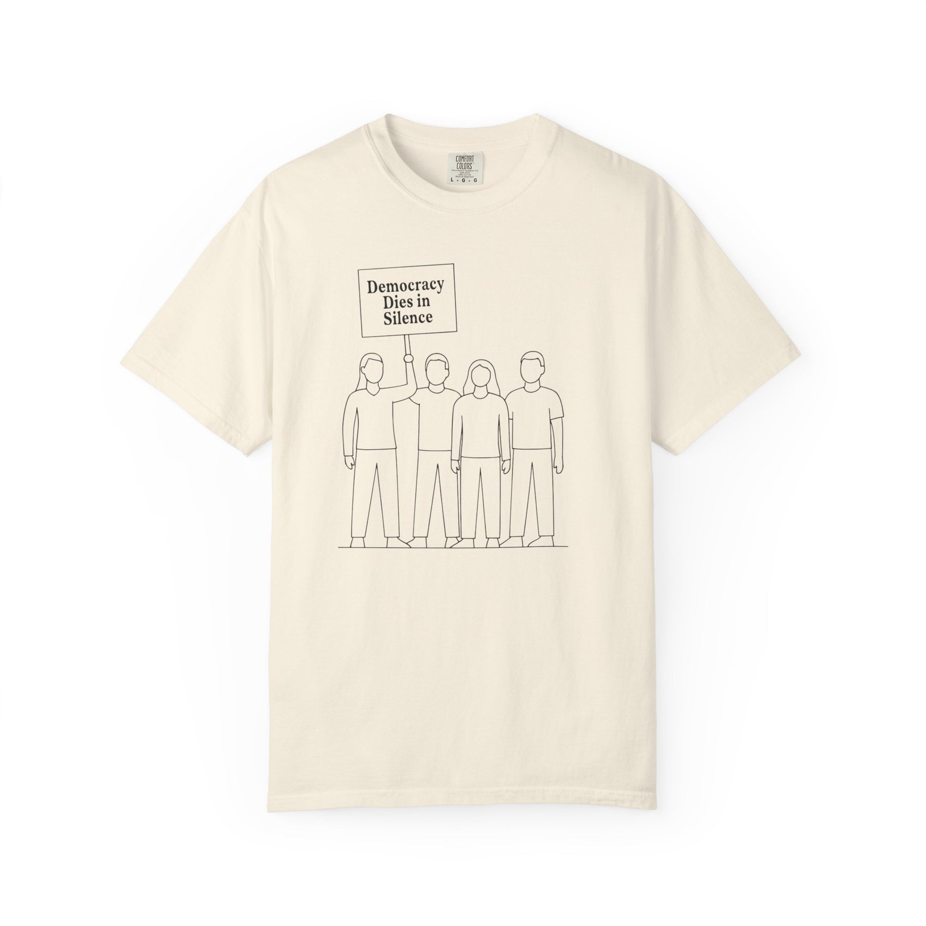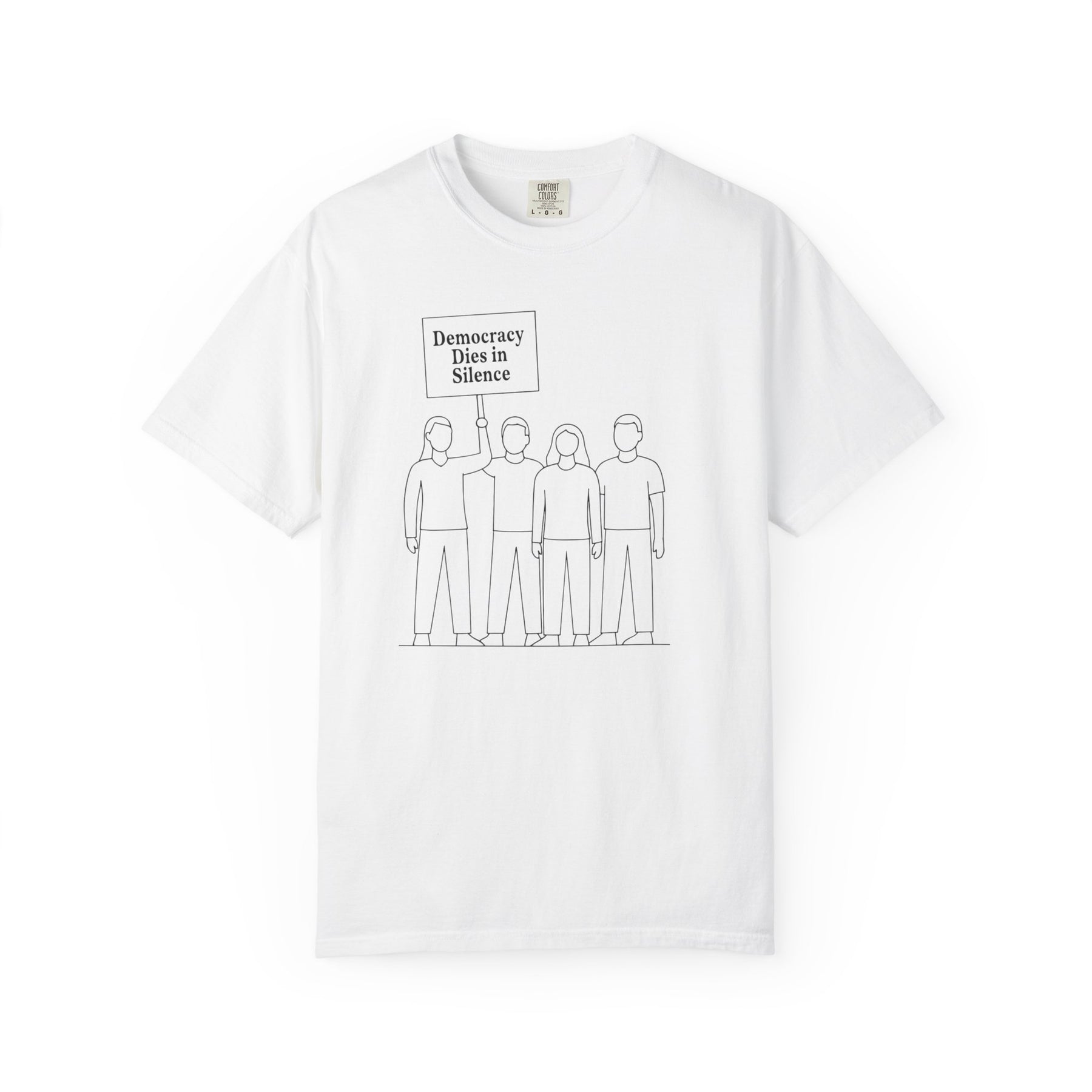 Raise your voice with the Democracy Dies in Silence T-Shirt. Featuring a minimalist line-art design of protestors holding a sign, this shirt is a powerful reminder of the importance of free speech, action, and accountability. It’s more than apparel — it’s a message.