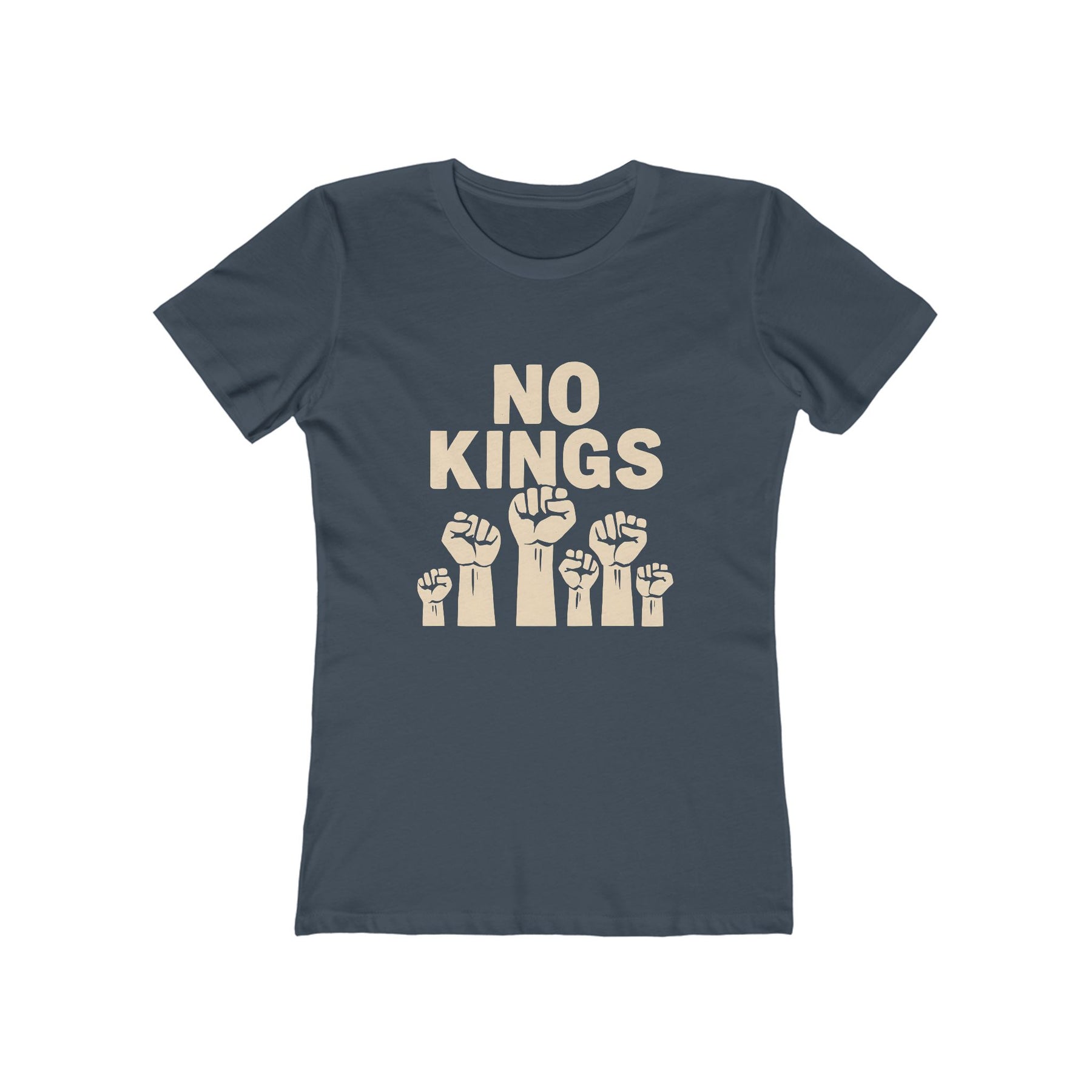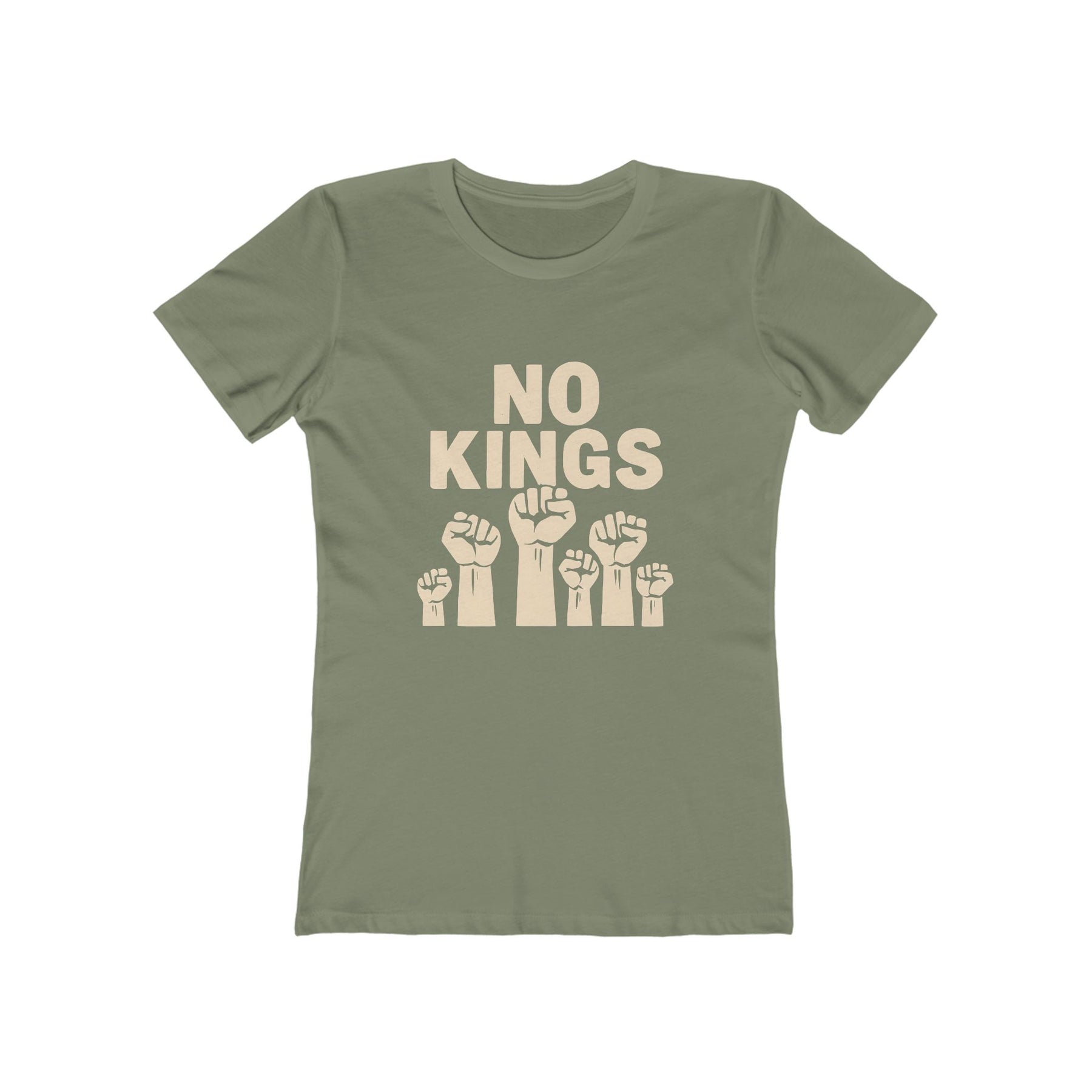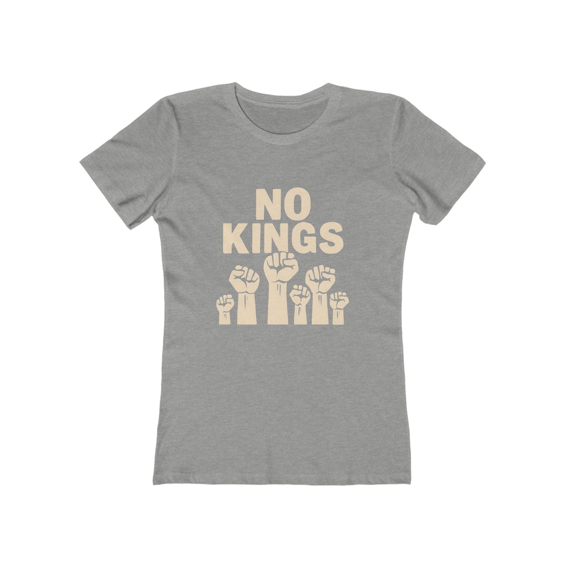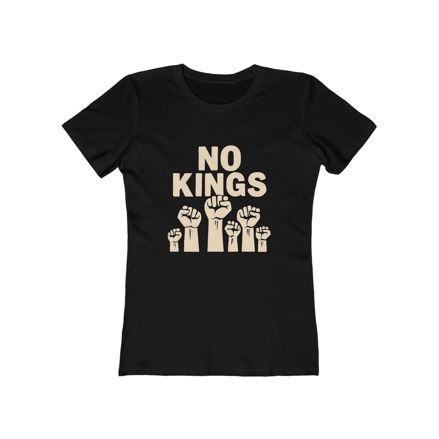 Raise your voice for equality and justice with the No Kings Women’s T-Shirt. Featuring bold lettering and a lineup of raised fists, this design embodies empowerment, unity, and resistance to oppression. It’s a powerful statement for women who believe true strength belongs to the people—not the crown.