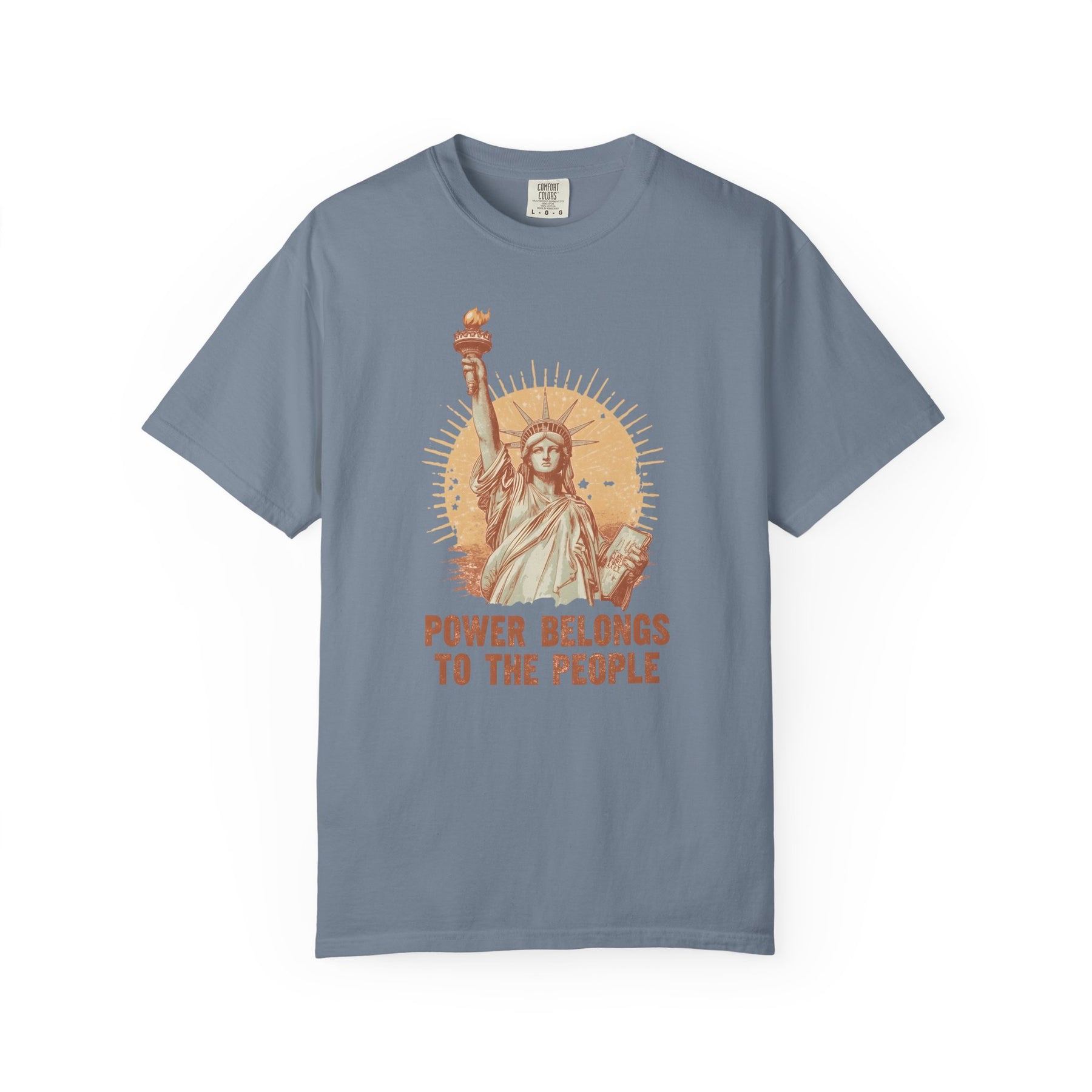 Stand tall and speak loud with the Power Belongs to the People T-Shirt. Featuring a bold vintage-style Statue of Liberty design with a distressed sunburst backdrop, this tee celebrates democracy, equality, and the enduring power of the people.