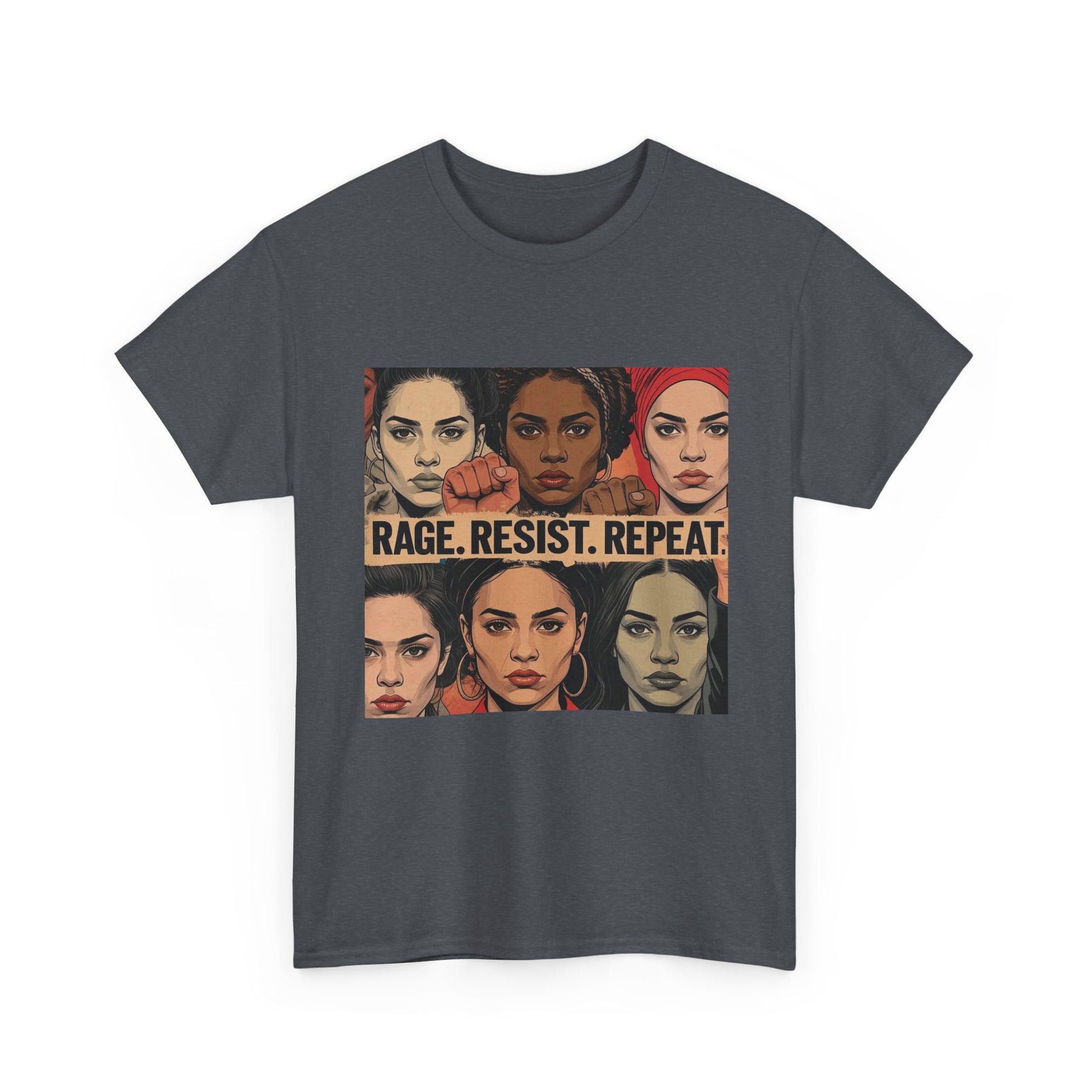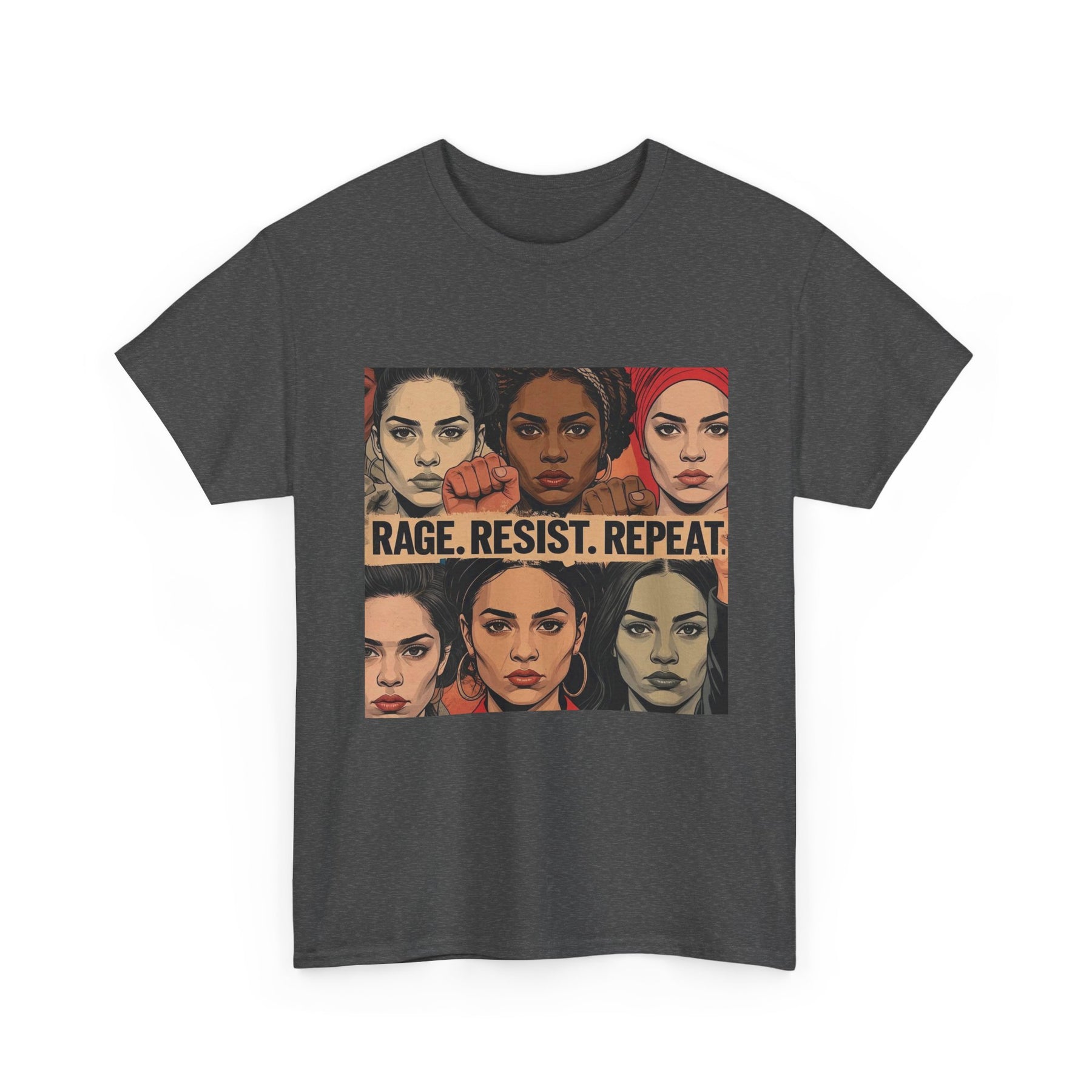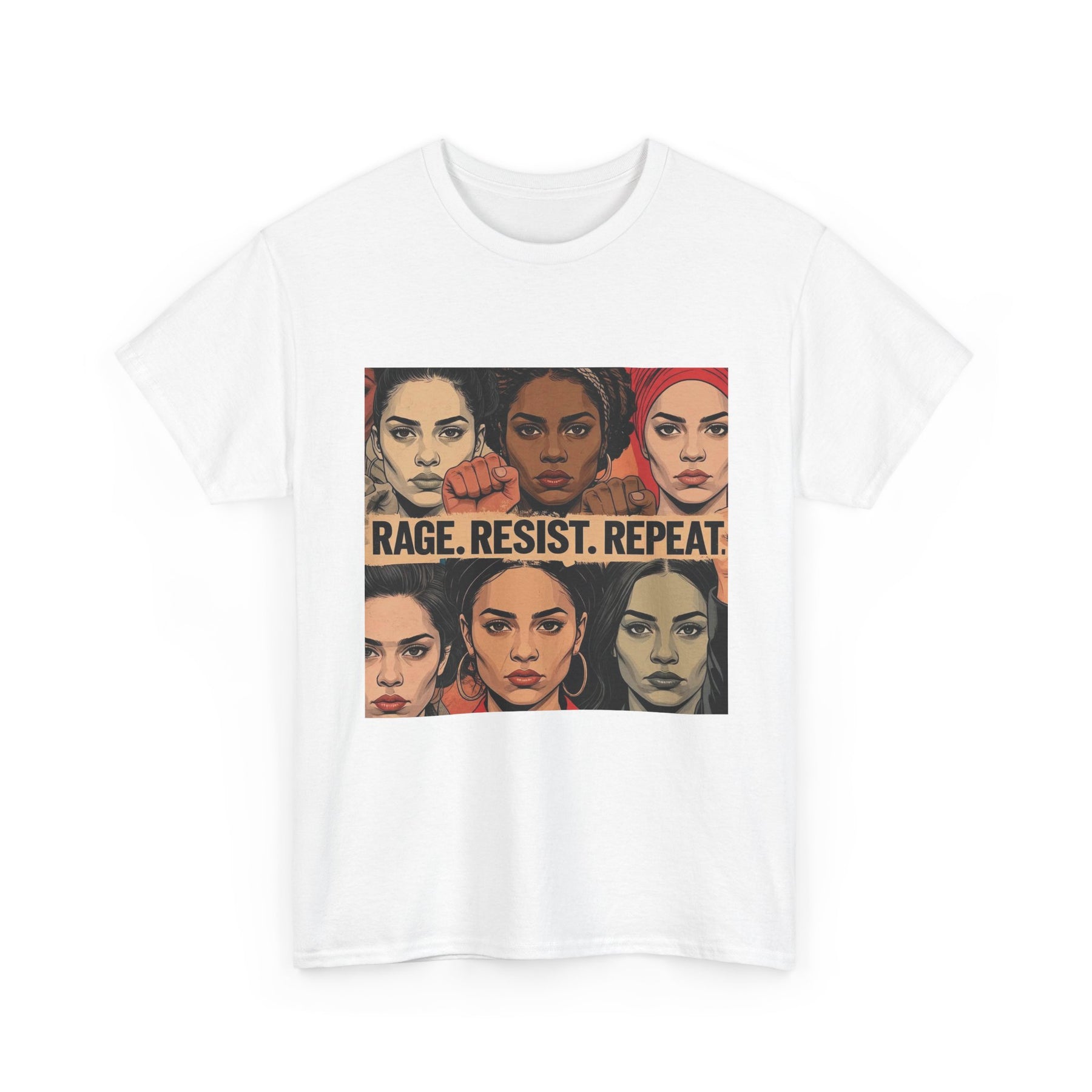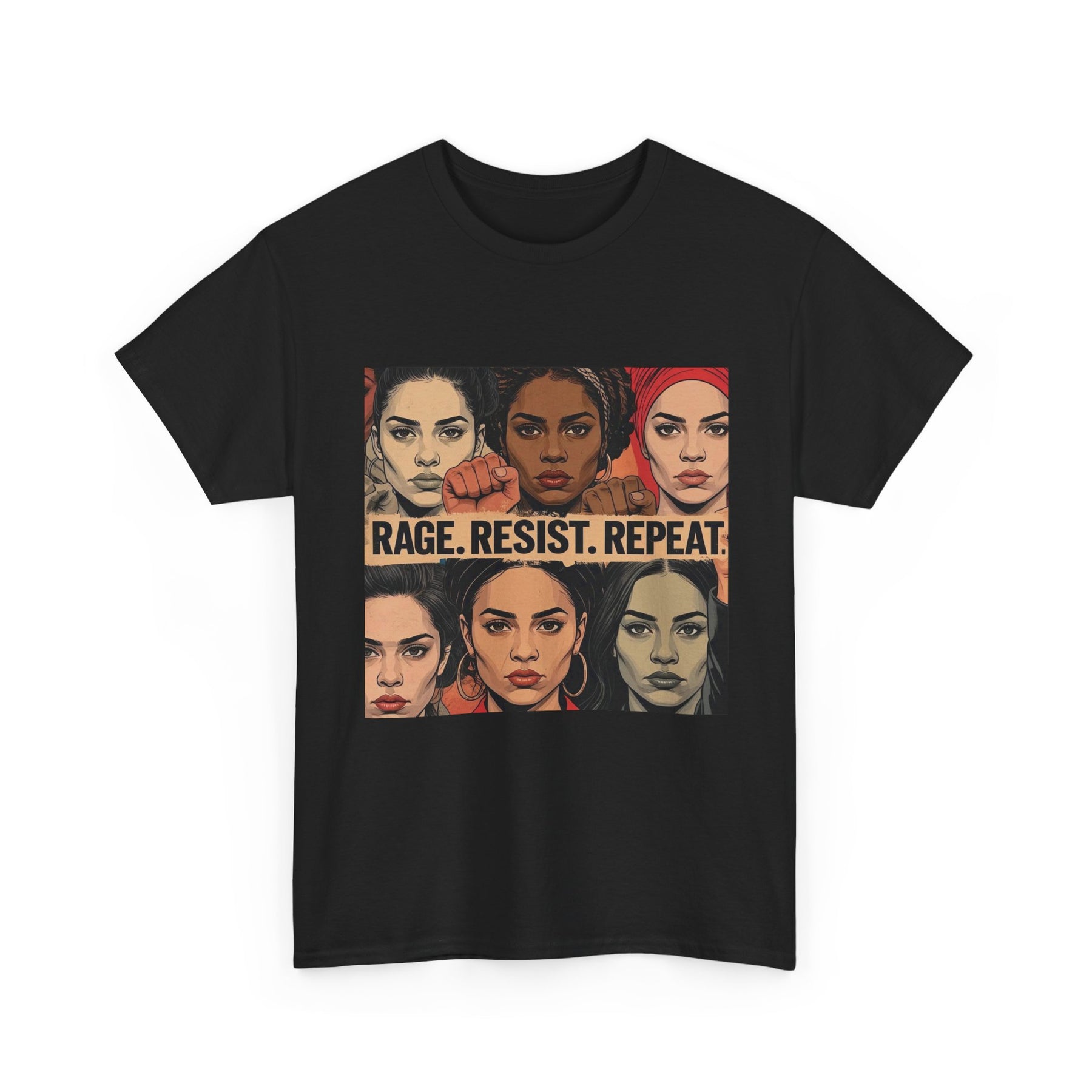 Feminism isn’t a phase — it’s a movement. The Rage. Resist. Repeat. T-Shirt features illustrated portraits of fierce, diverse women united under a powerful mantra of persistence and strength.