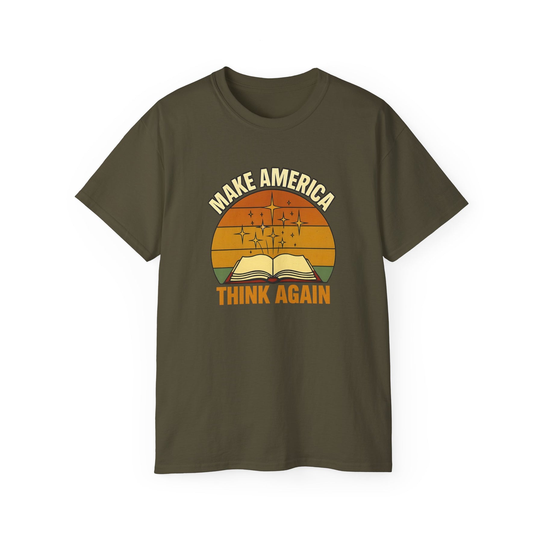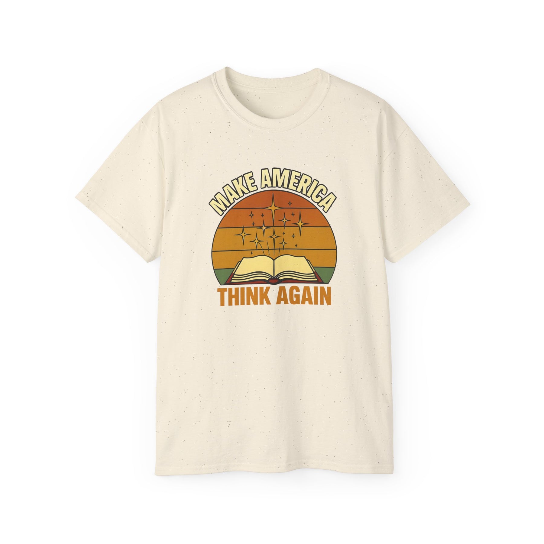 Less noise. More thought. The Retro Open Book Tee is a rallying cry for curiosity and intellect. Featuring a vintage sunset backdrop and an open book graphic, it’s a wearable reminder to “Make America Think Again.” Bold yet understated, it speaks volumes — literally.
