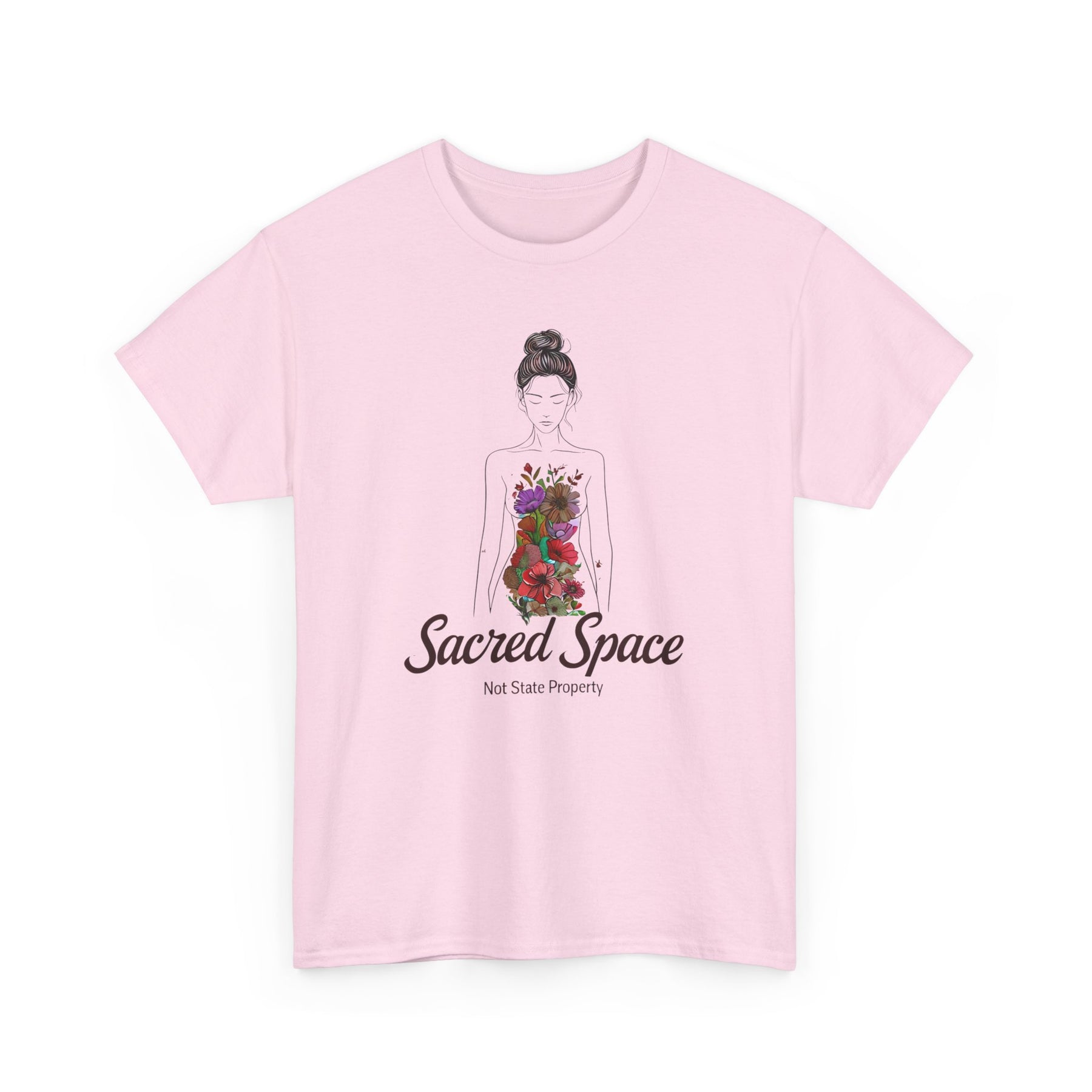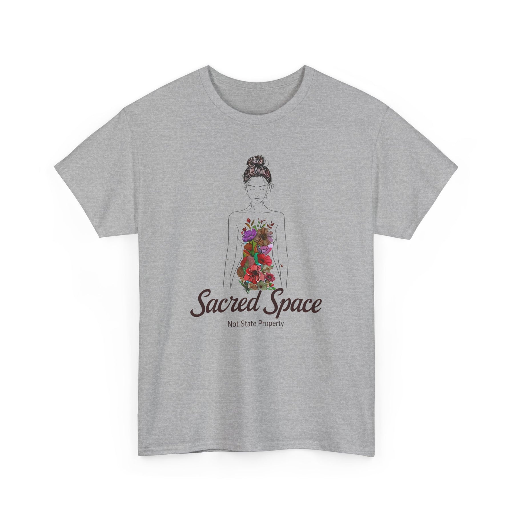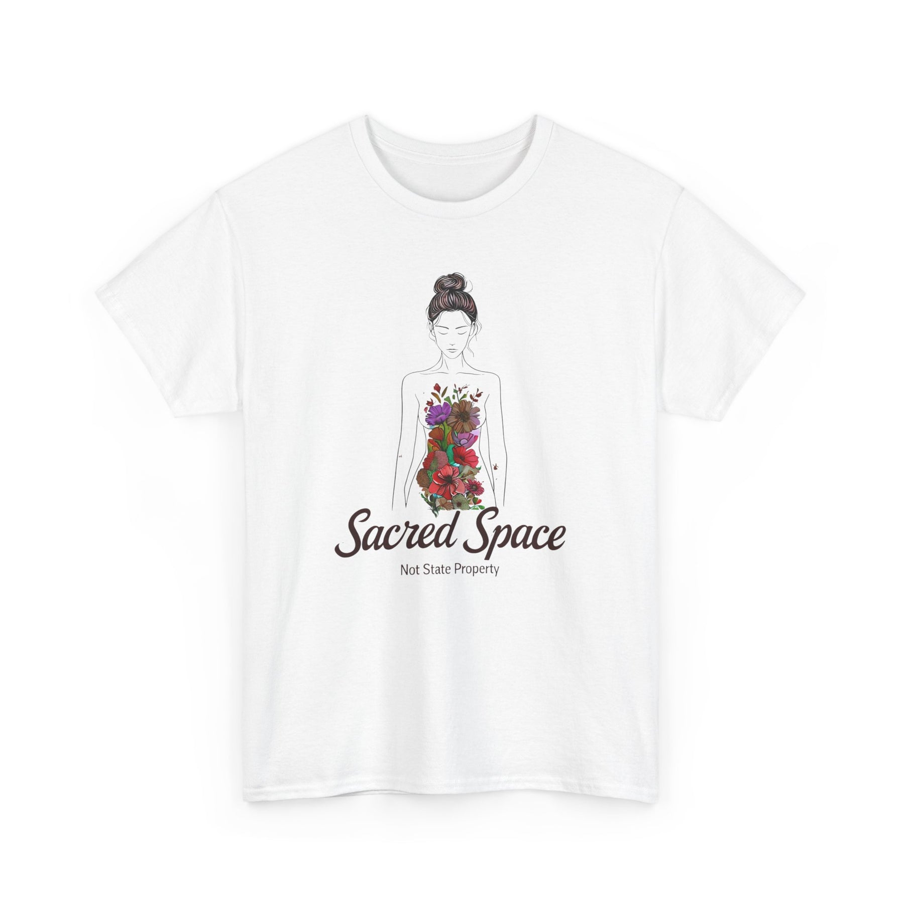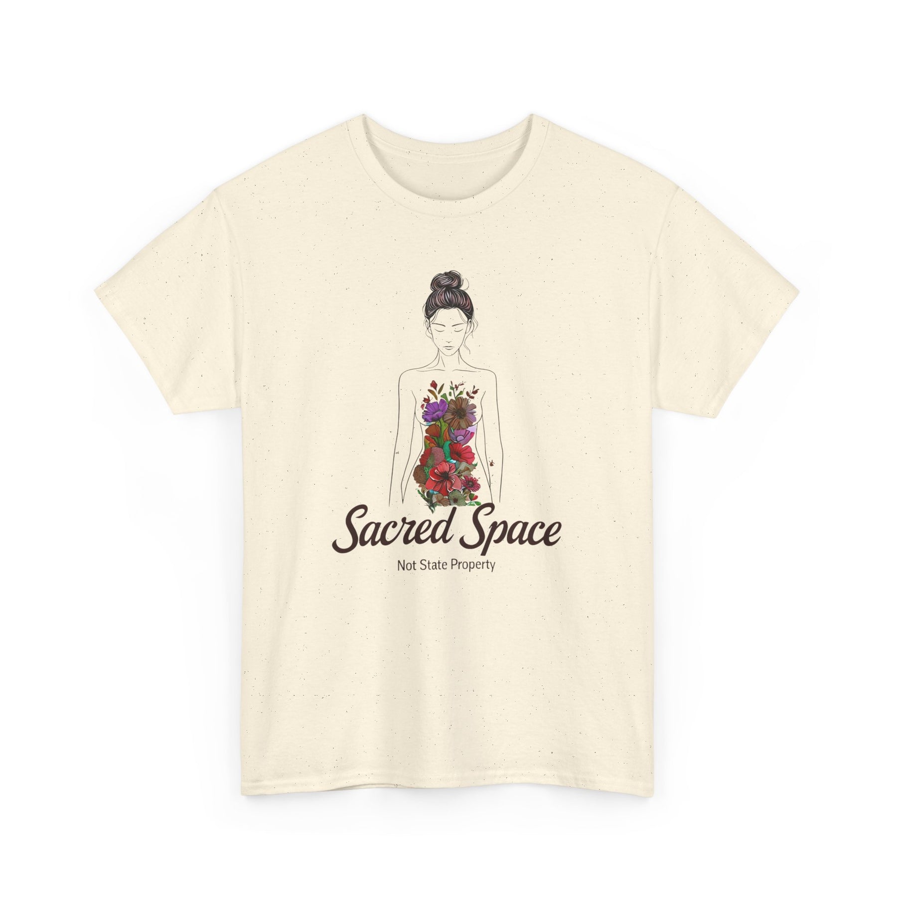 Your body is not up for debate. The Sacred Space – Not State Property T-Shirt features a peaceful line-drawn woman adorned with blooming florals — a soft yet unapologetic stand for body autonomy, self-ownership, and reproductive rights.