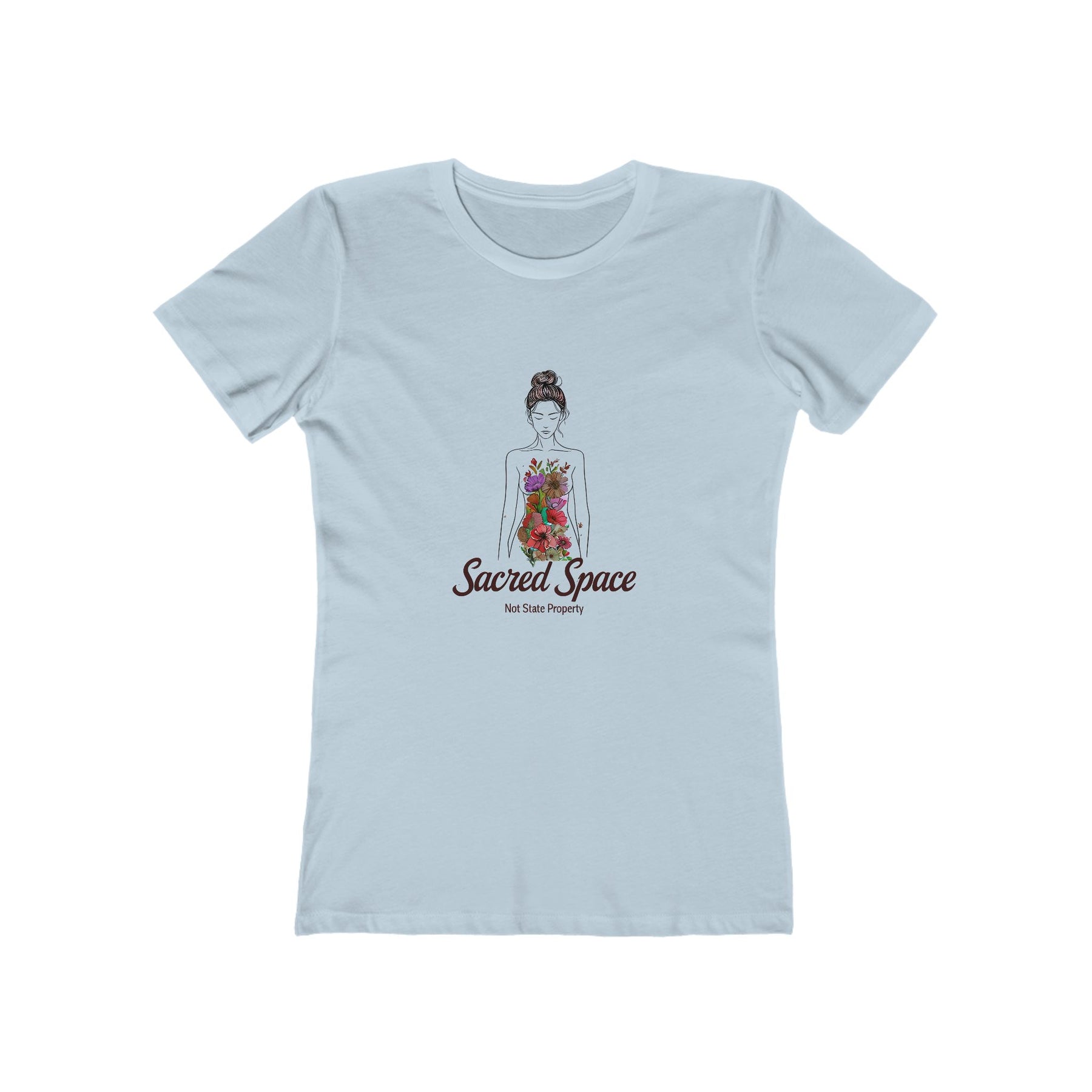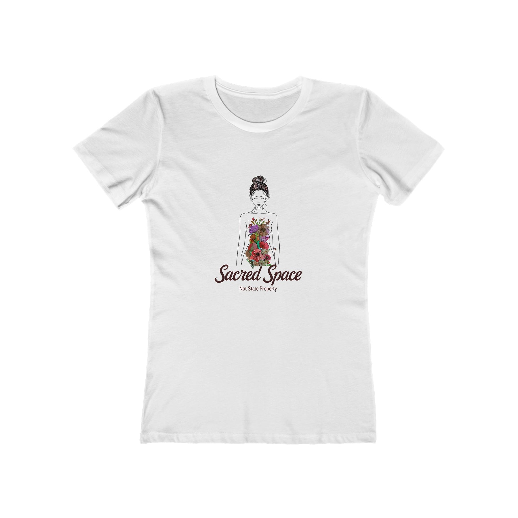 Make a bold statement with our Sacred Space – Not State Property T-Shirt. Featuring a delicate line-art design of a woman adorned with floral details, this empowering graphic tee highlights the importance of body autonomy and self-determination.