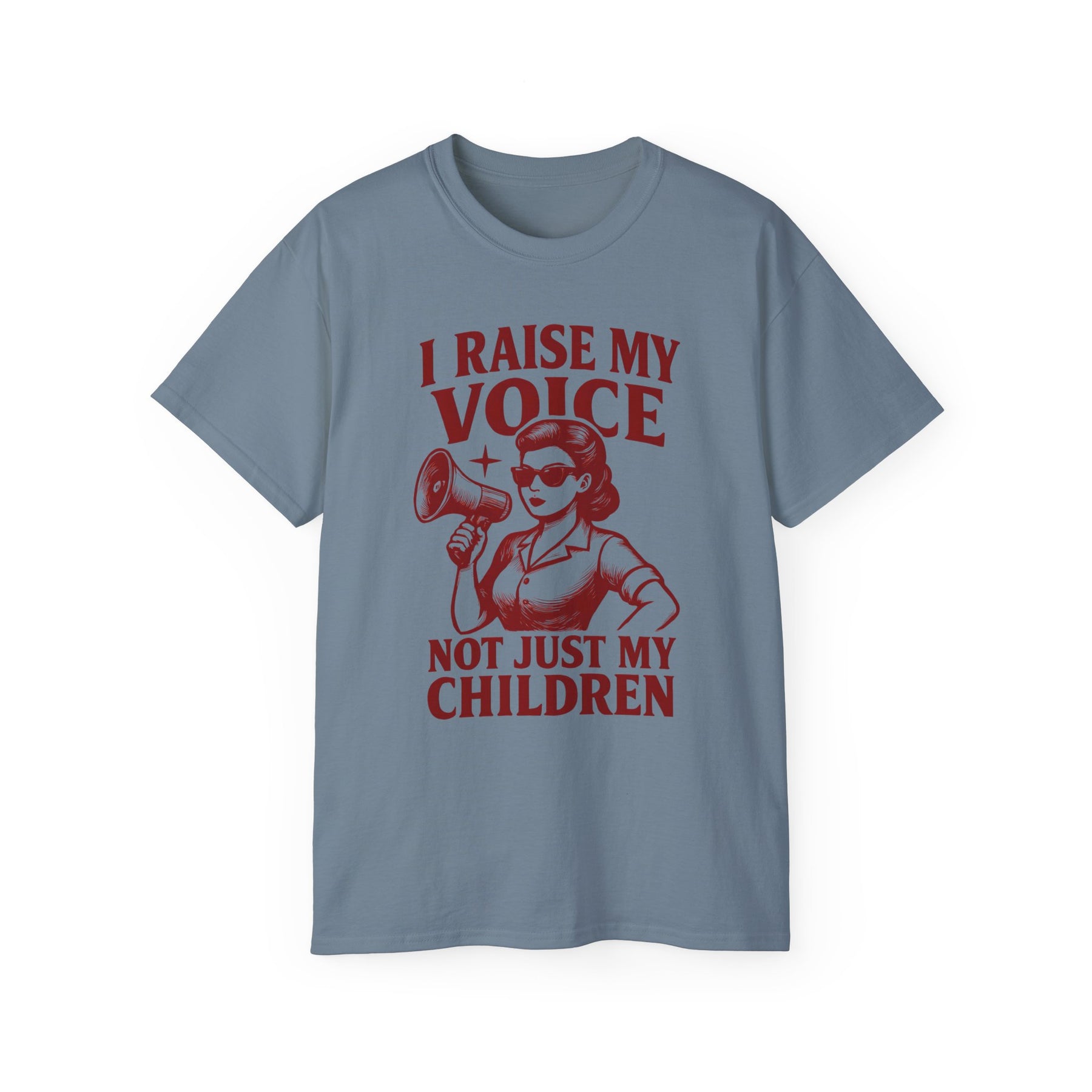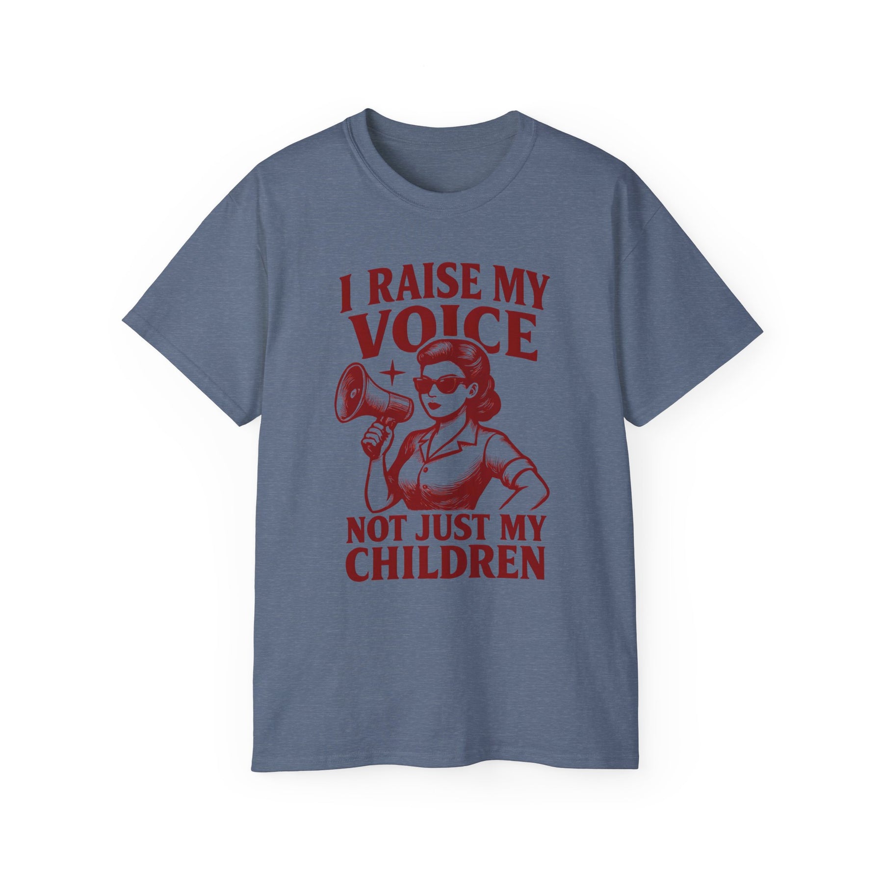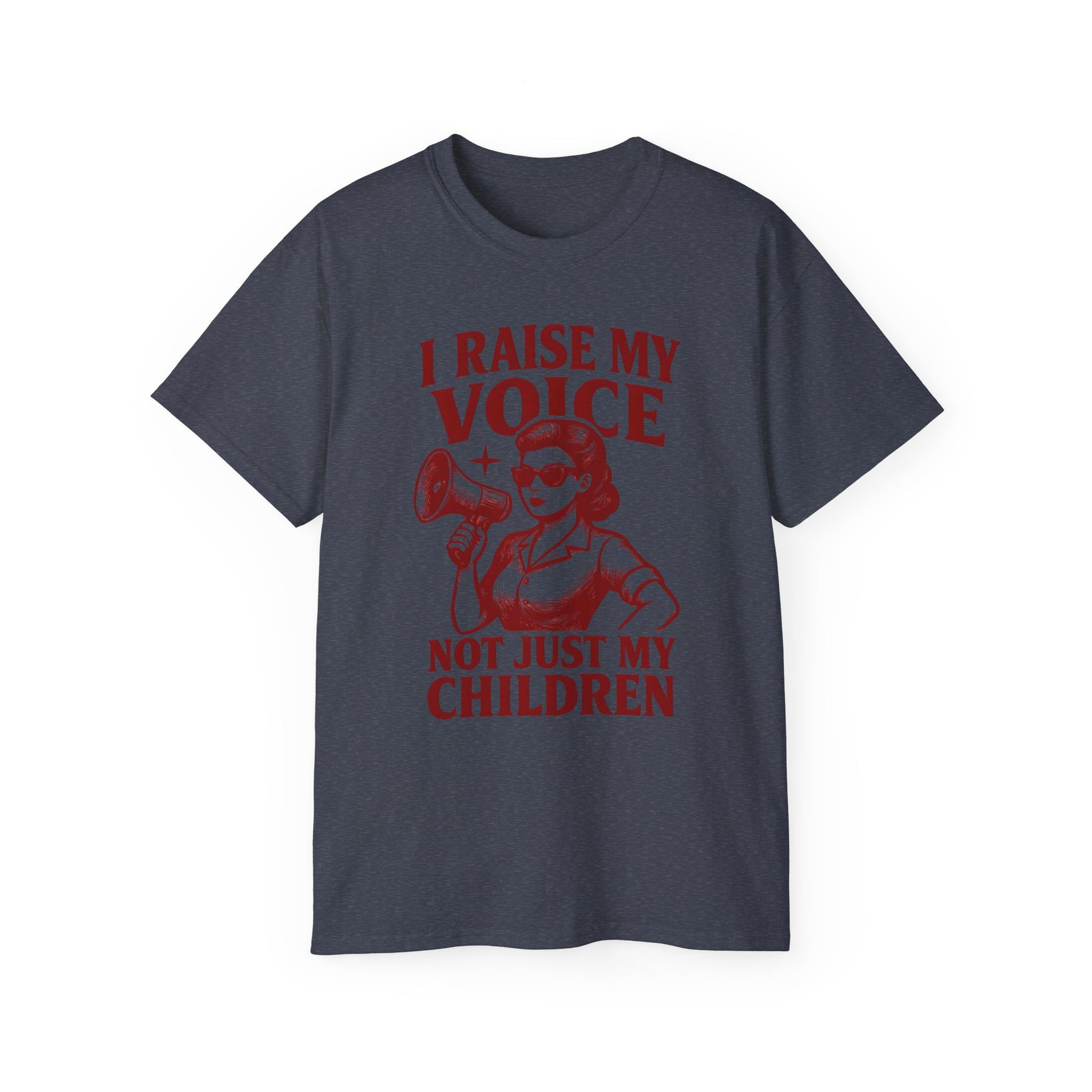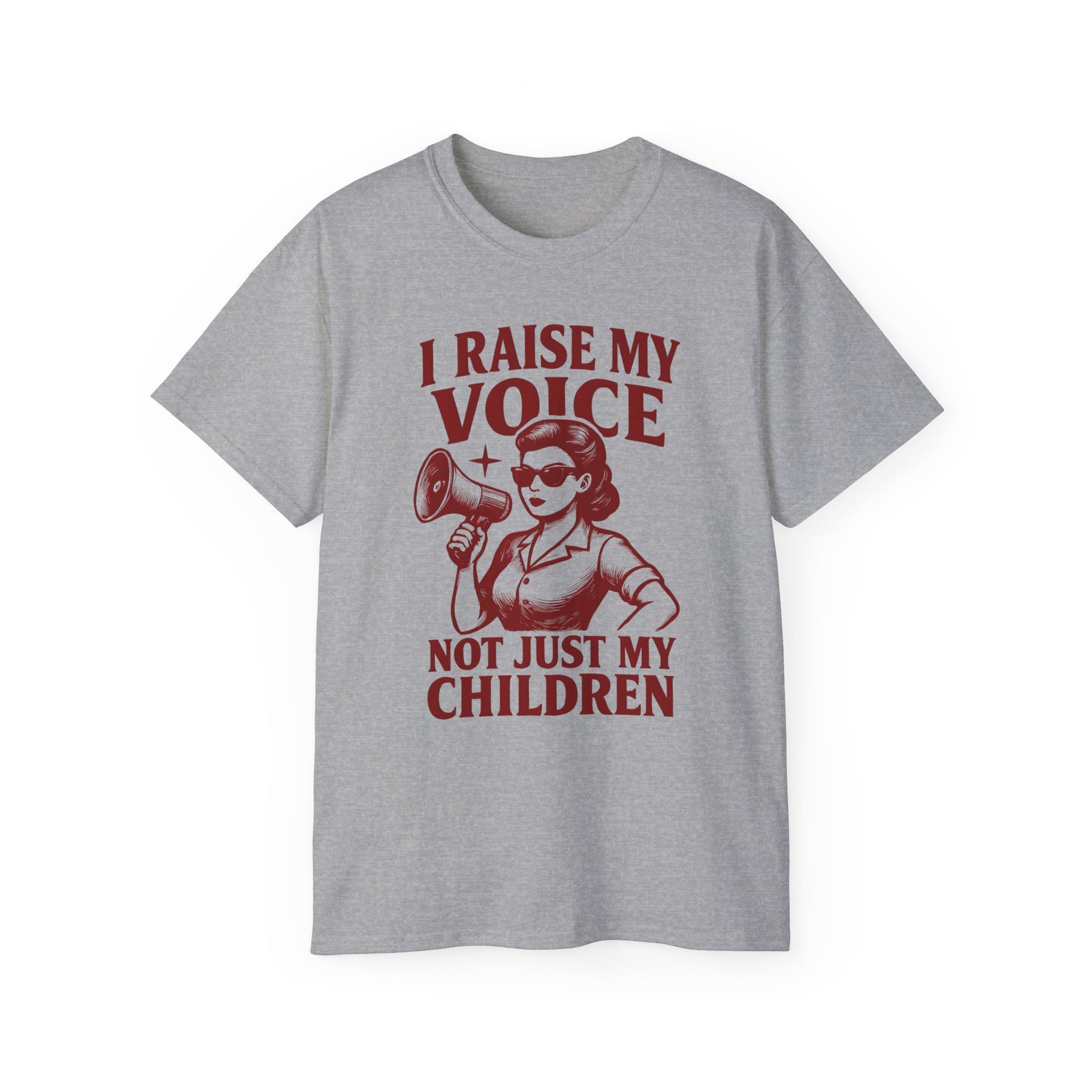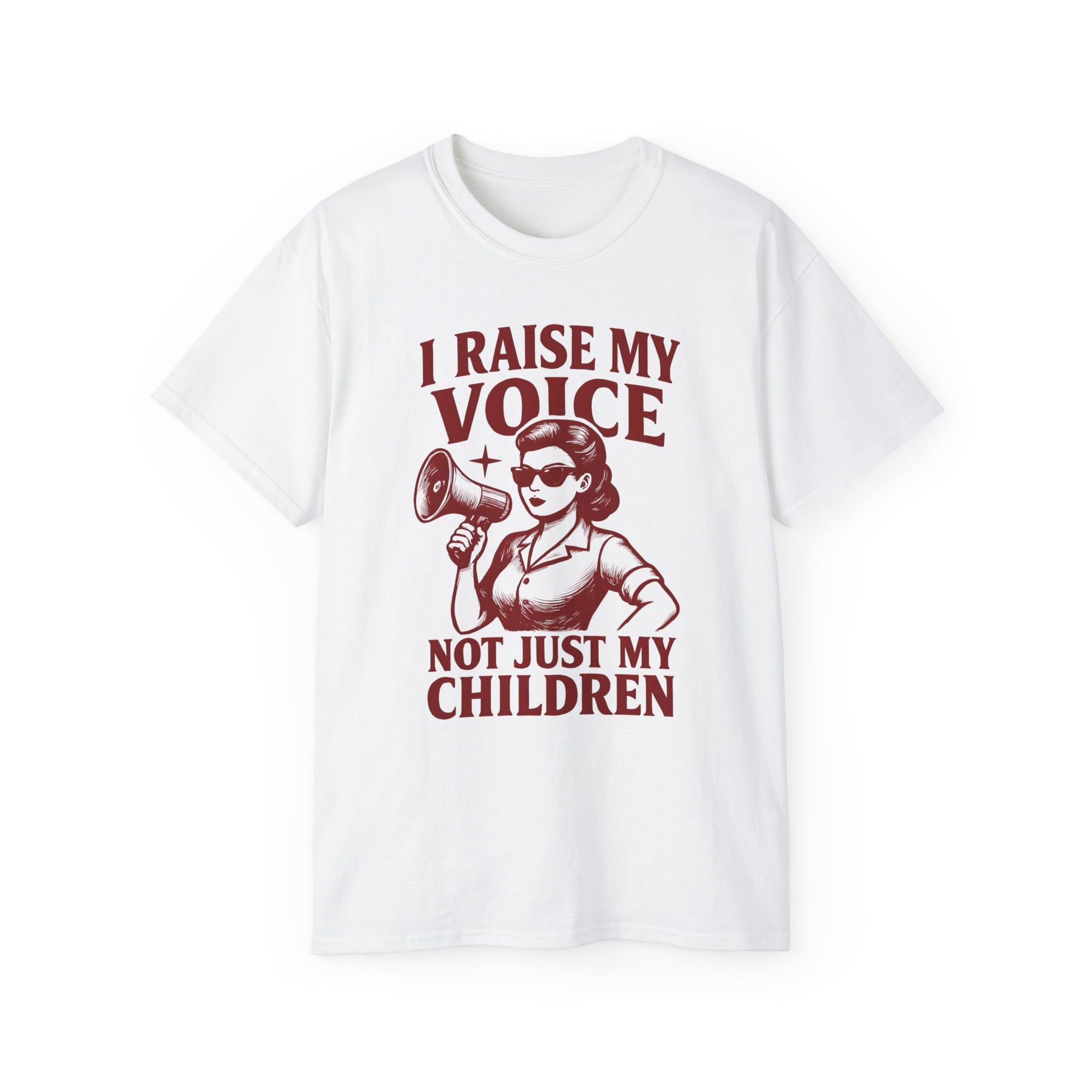 Make your statement loud and clear with our I Raise My Voice, Not Just My Children T-Shirt. Featuring a bold vintage-style graphic of a powerful woman holding a megaphone, this shirt is a celebration of strength, advocacy, and empowerment.