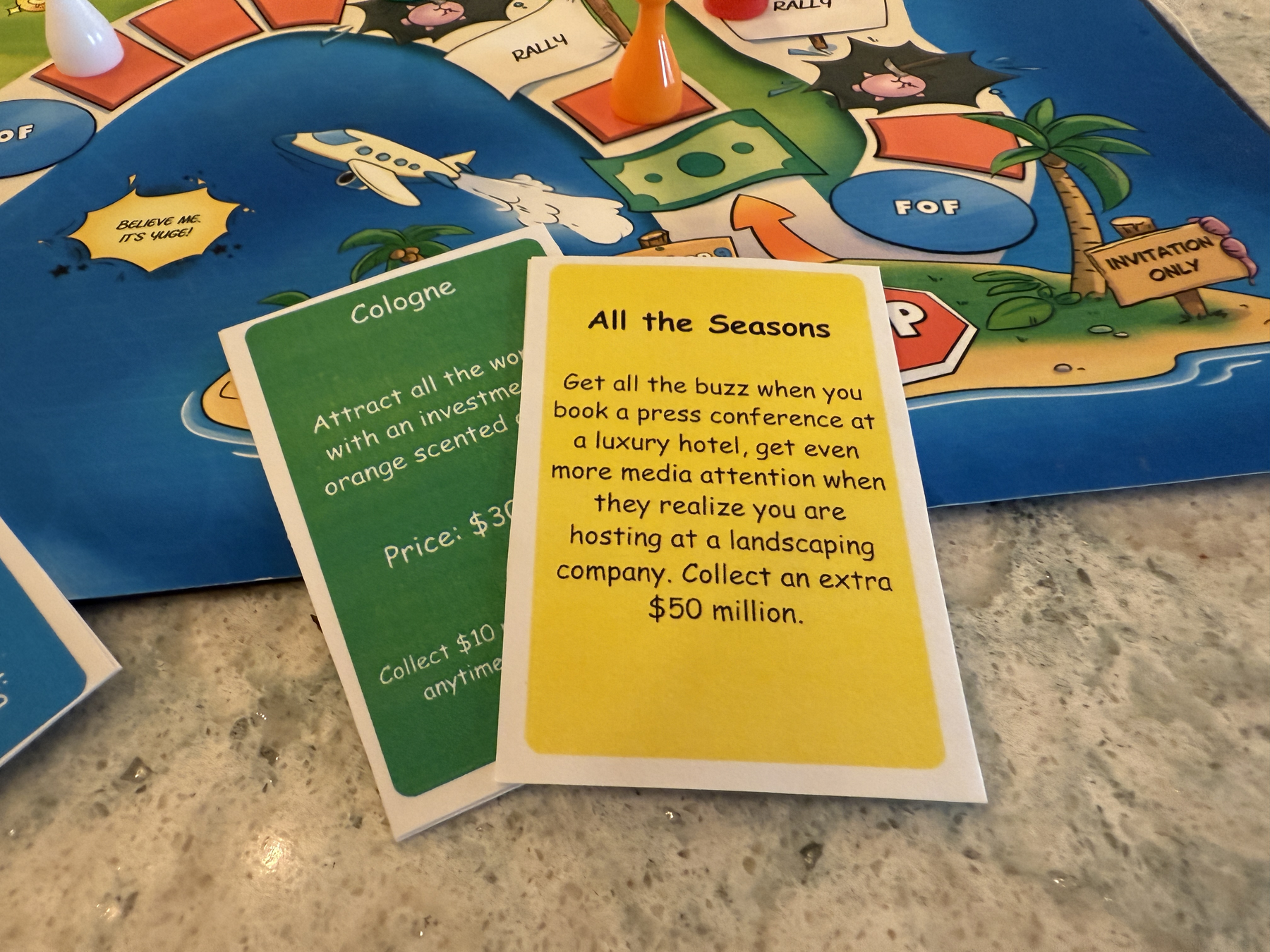 Take a ride down the escalator and prove what a Stable Genius you are as you wind your way through the path to riches and glory. Earn money at rallies, make savvy investments, encounter lots of crazy action and determine who is a friend or foe as you wind through the board and seek out retirement at the country club. In this sharp-witted parody board game, you’ll navigate the murky waters of power by spinning scandals, rallying supporters, and sacrificing ideals for money. Every spin presents opportunities and obstacles: pander to your base, appease your donors, or face setbacks from your enemies and your own decisions. This game gives you the opportunity to laugh about the absurdity of our times.