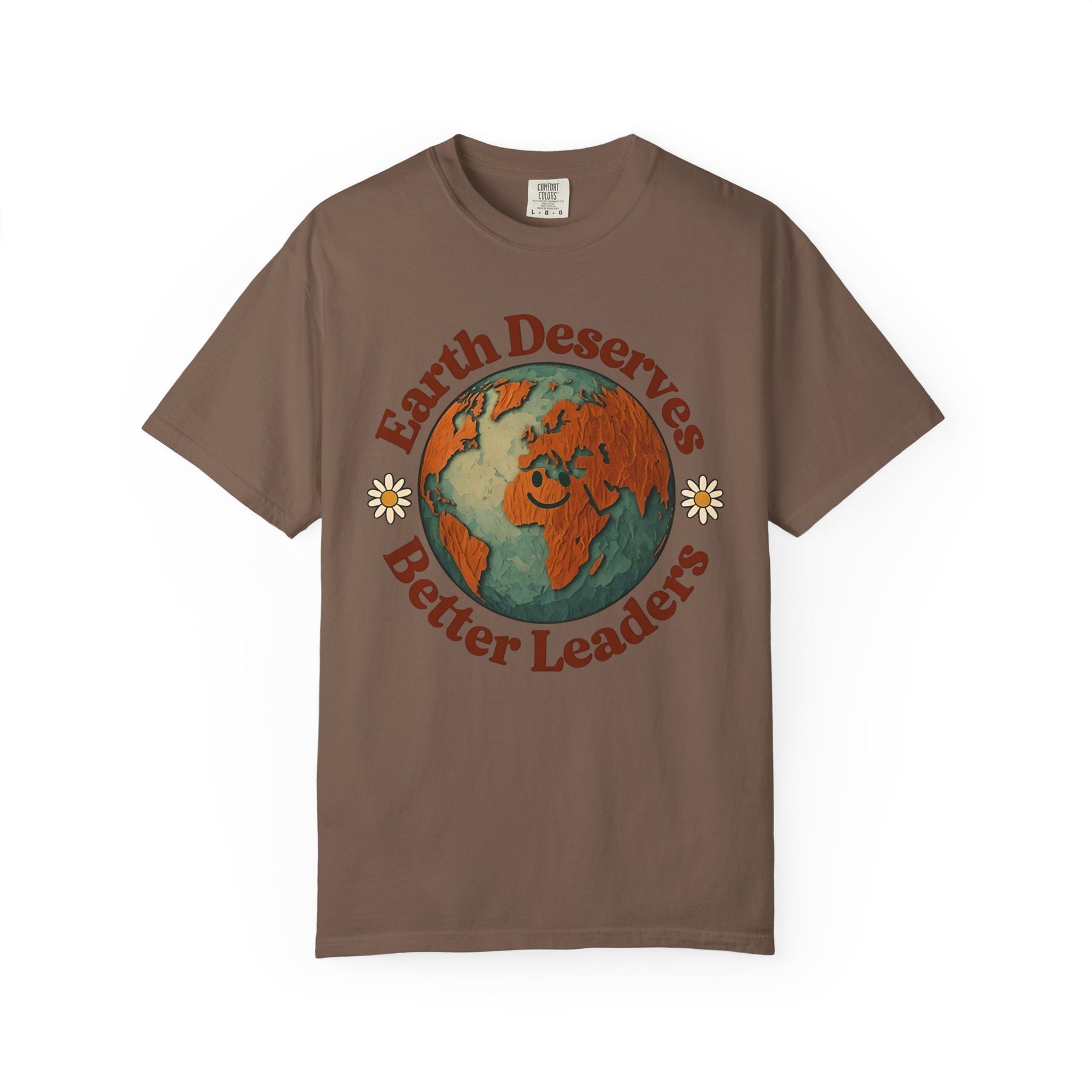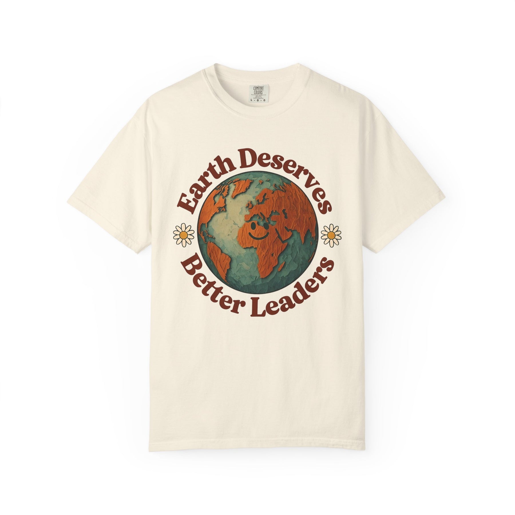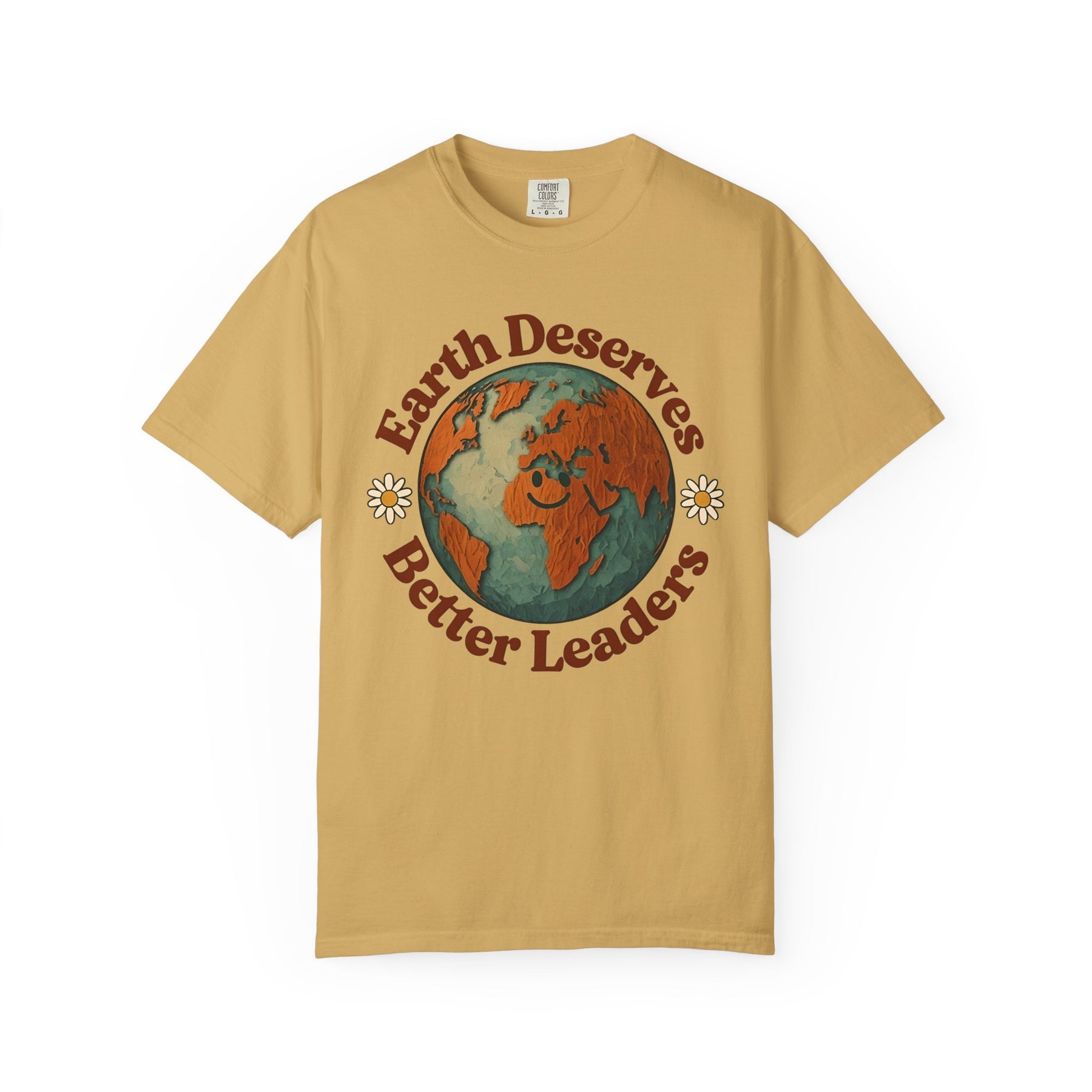 Speak your truth and wear it proudly. This “Earth Deserves Better Leaders” T-shirt is a bold and earthy statement piece for eco-warriors, activists, and anyone who believes in a better future. Featuring a retro-style globe with rich, warm tones and daisy accents, this unisex tee blends vintage charm with a powerful modern message. Perfect for Earth Day, climate marches, or everyday activism. Soft, breathable, and ethically printed—because your values should be worn with pride. Introducing the ultimate Unisex Garment-Dyed T-shirt—a cozy staple that merges style and comfort effortlessly. This tee radiates a relaxed vibe, perfect for adding a touch of laid-back elegance to any outfit. Whether you're lounging at home, catching up with friends, or heading to a casual gathering, this shirt fits seamlessly into your everyday life. Ideal for eco-conscious individuals and anyone wanting to make a statement, it’s a thoughtful choice for Earth Day celebrations, casual summer outings, or to simply express your values. Available in a whopping 58 colors, it’s easy to find a hue that matches your personality! Product features - Available in sizes S to 4XL for the perfect fit. - Durable double-needle stitching on all seams for longevity. - Crafted without side seams for a sleek, attractive look. - Garment-dyed for a soft texture and rich color. - Made from 100% US cotton, ethically sourced and sustainable. Care instructions - Machine wash: cold (max 30C or 90F) - Do not bleach - Tumble dry: low heat - Iron, steam or dry: low heat - Do not dryclean