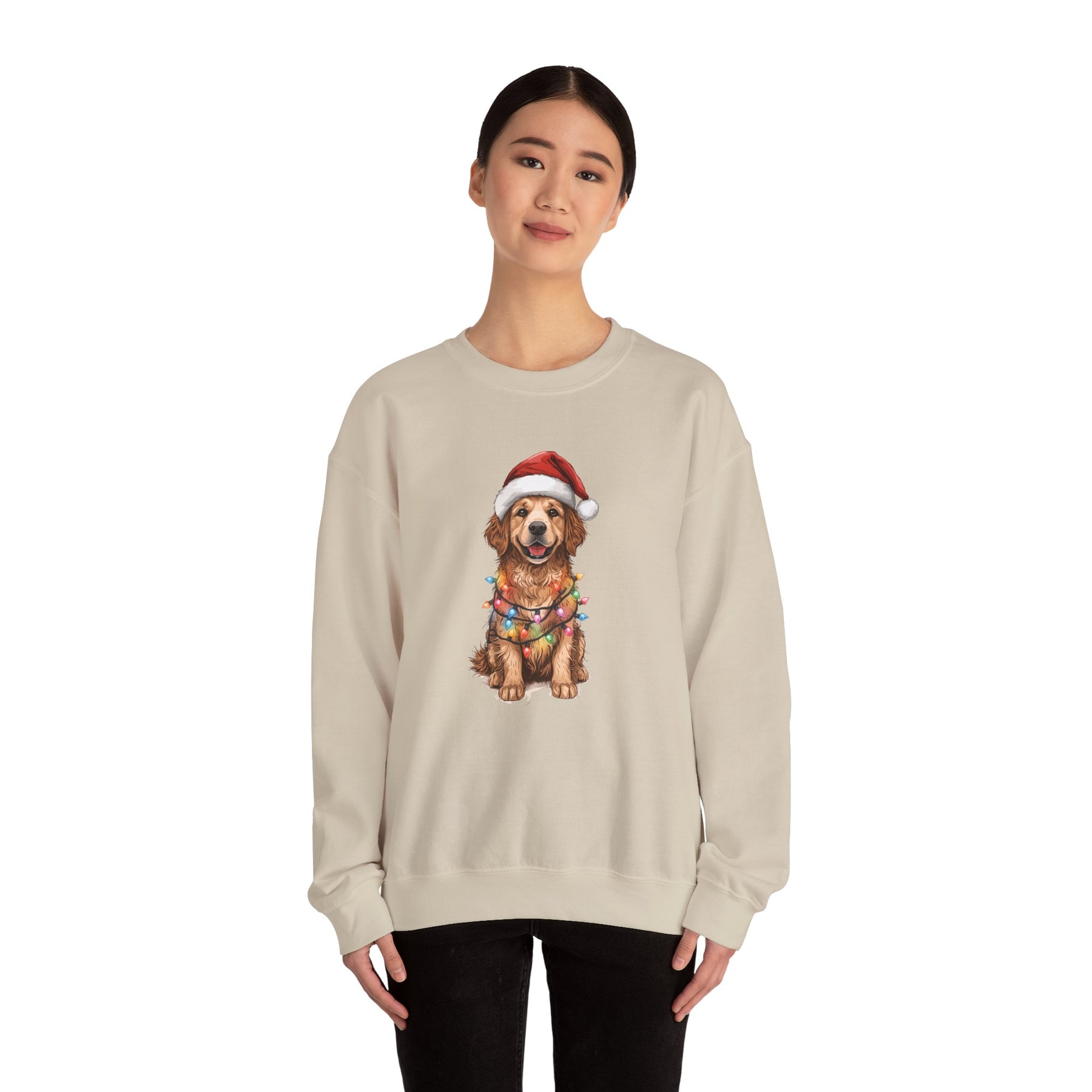 This festive sweatshirt features an adorable golden retriever wrapped in twinkling Christmas lights and topped with a Santa hat, ready to brighten the season. It’s the perfect cozy piece to wear while decorating the tree, sipping cocoa, or snapping those holiday photos.